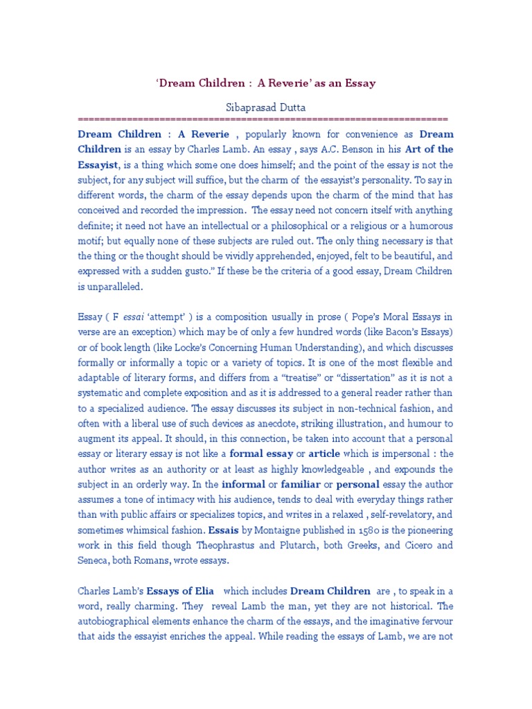 He is depressed at the death of his beloved Alice and feels guilty for not marrying her. Towards the end of the essay, a twist in the essay comes when all the events in the story turn out to be a dream children essayist. This adds suspense to the essay along with an open end, dream children essayist. Generic filters Hidden label. Hidden label. More From Charles Lamb. Essays Dream Children Poor Relations.