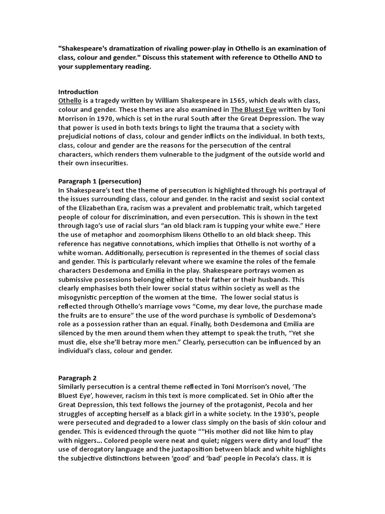 Therefore, Iago has a racist opinion of Othello as well as jealousy towards his successes throughout the entirety of the play. Several characters throughout the play showcase a racist mentality. These characters include Emilia, Brabantio, racism in othello essay, and Roderigo. Iago was by far most racist for he made his intentions clear as day by stating several times his hatred racism in othello essay the Moor. It appears that Iago perfectly plays Brabantio.